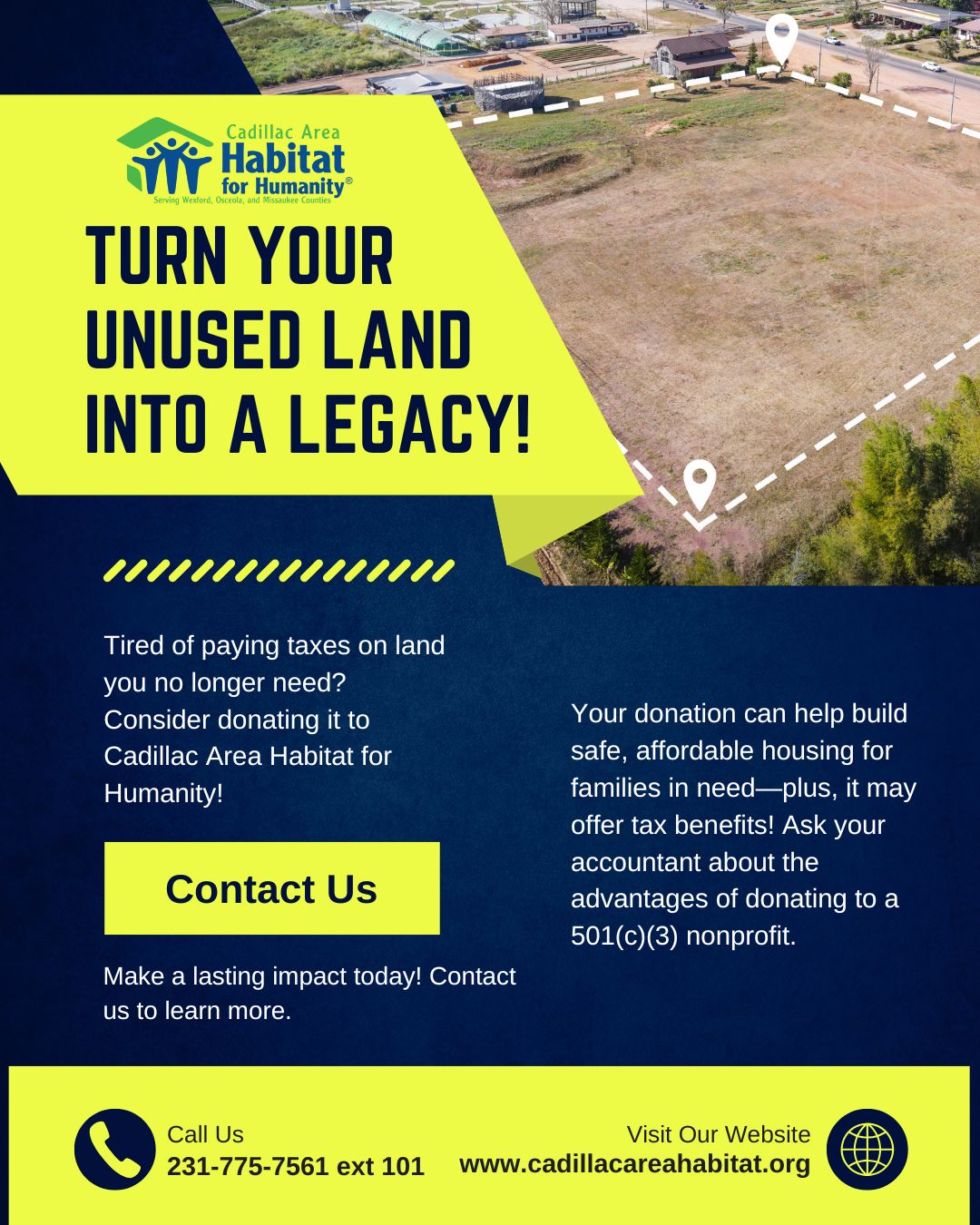 Did you know that a land donation can help build brighter futures for local families? At Cadillac Area Habitat for Humanity, land donations play a vital role in making homeownership possible. Your unused property could become the site of a safe and affordable home, offering a fresh start for a family in need. Plus, land donations may offer valuable tax benefits for you or your estate. Leave a lasting legacy in our community. To learn more about how you can turn land into hope, visit our website or contact us directly. We are specifically in need of land in the Osceola and Missaukee Counties. Together, we’re building more than homes; we’re building futures. |